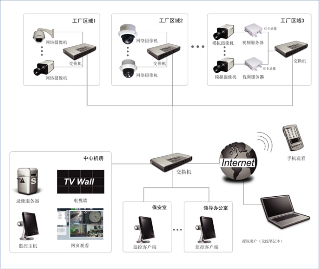 在公司保安部設立中央監控中心,管理公司所有的設備;在工廠、倉庫、宿舍等地設立區域監控室,用以管理本地的設備。